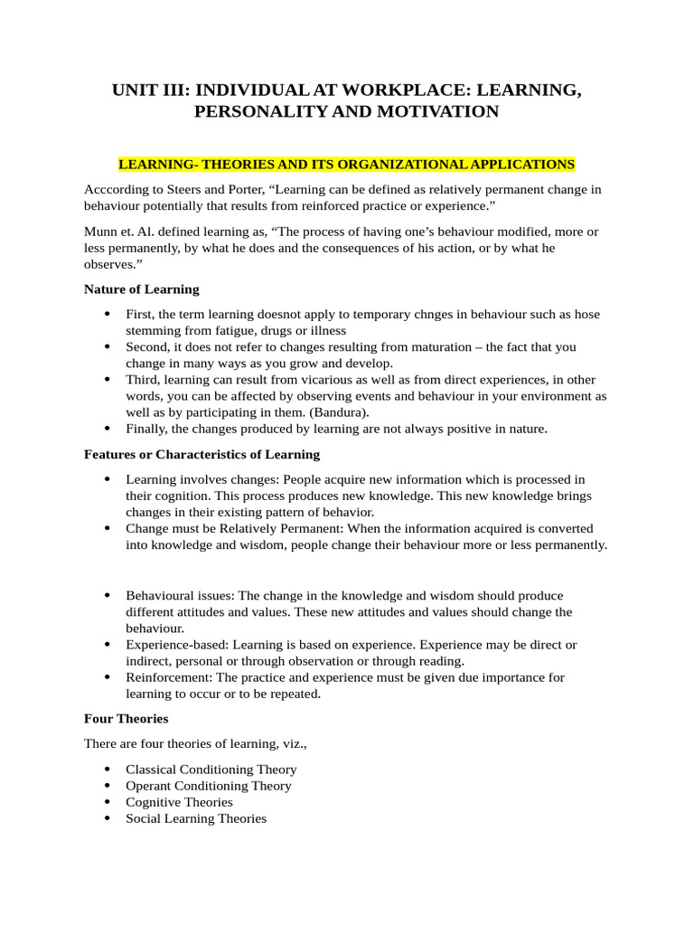 UNIT III: INDIVIDUAL AT WORKPLACE: LEARNING,