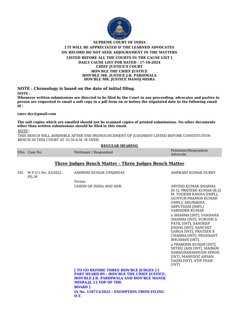 DAILY CAUSE LIST FOR DATED : 17-10-2024