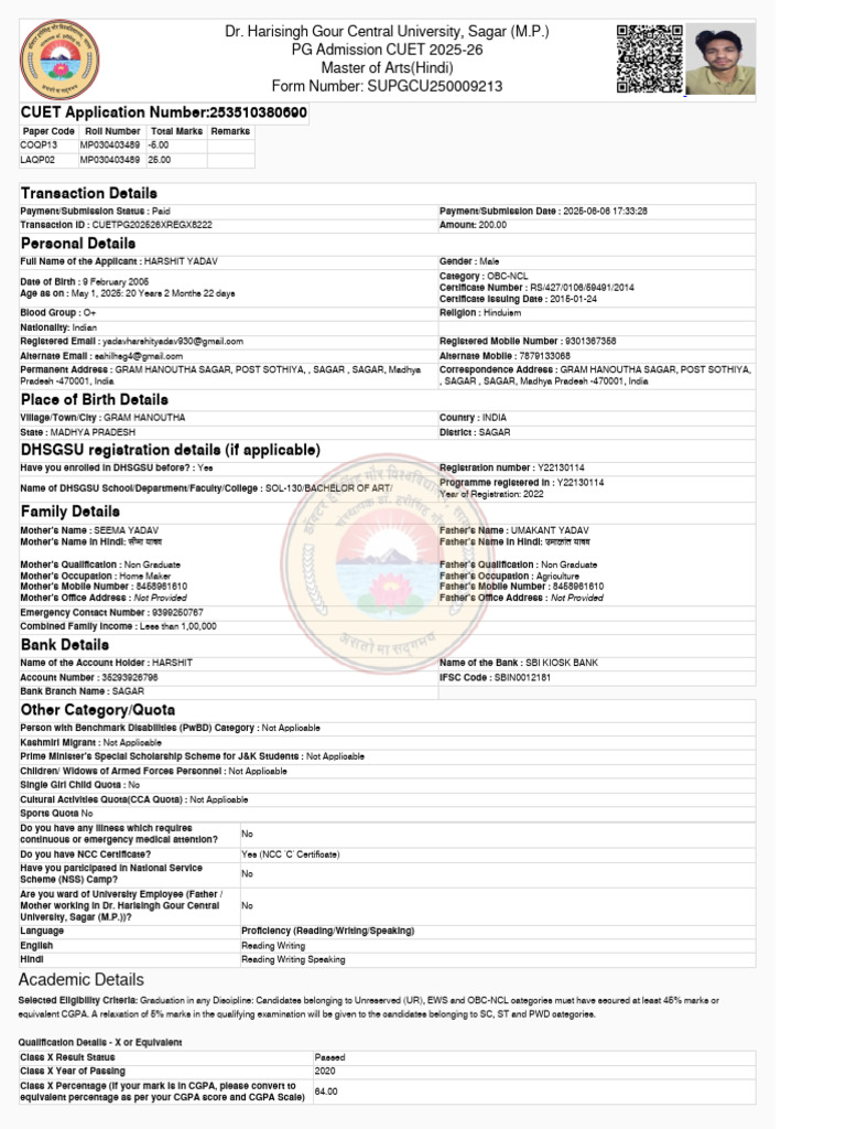 Full Name of the Applicant : HARSHIT YADAV Gender : Male