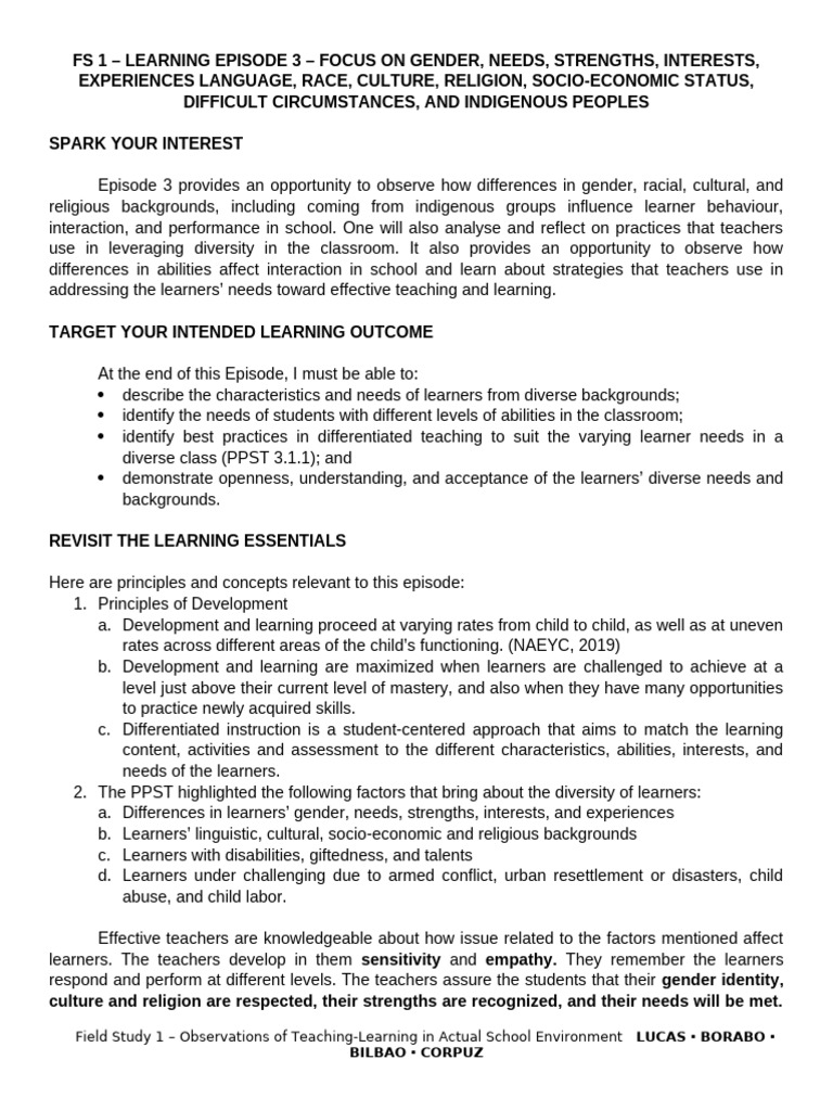 FS 1 – LEARNING EPISODE 3 – FOCUS ON GENDER, NEEDS, STRENGTHS, INTERESTS,
