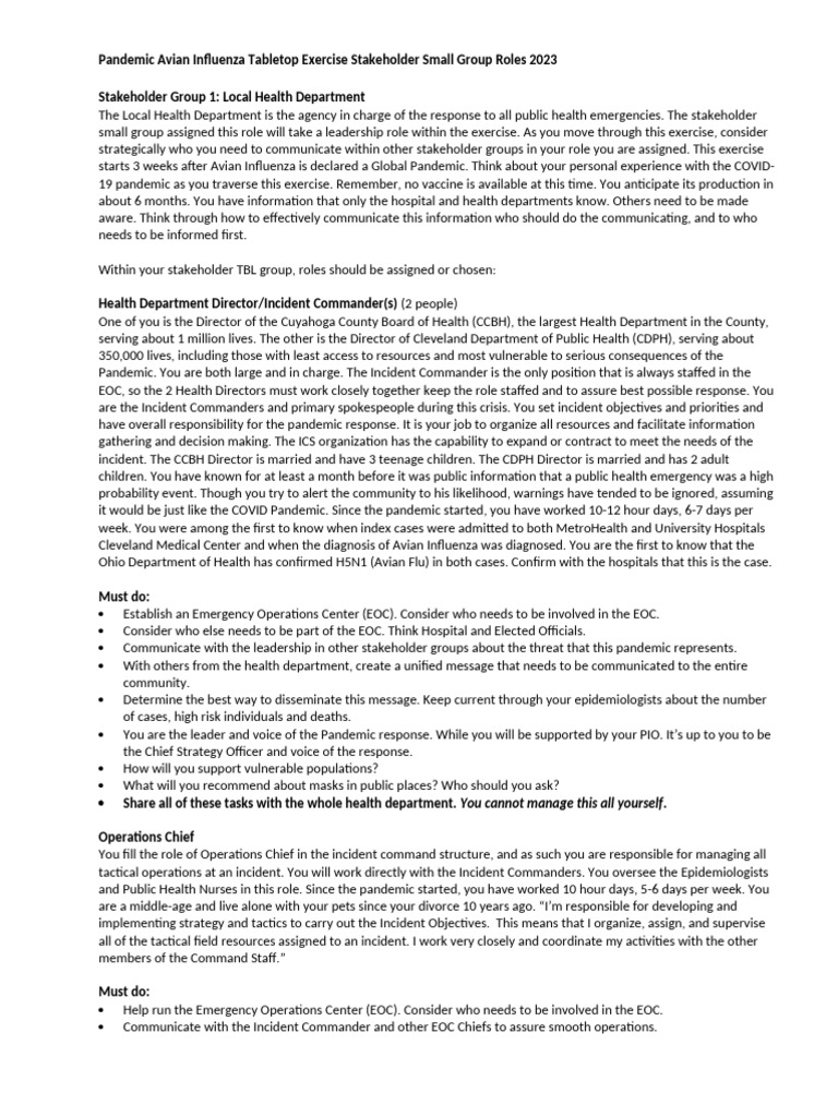 Pandemic Avian Influenza Tabletop Exercise Stakeholder Small Group Roles 2023