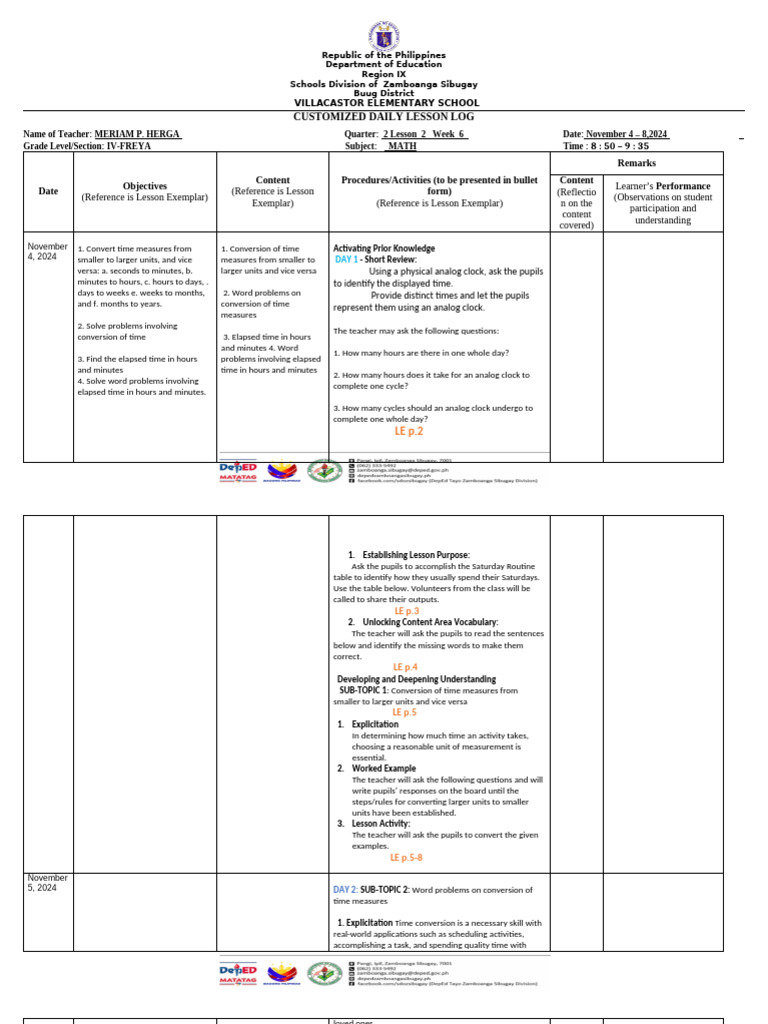 Name of Teacher: MERIAM P. HERGA Quarter: 2 Lesson 2 Week 6_ Date: November 4 – 8,2024