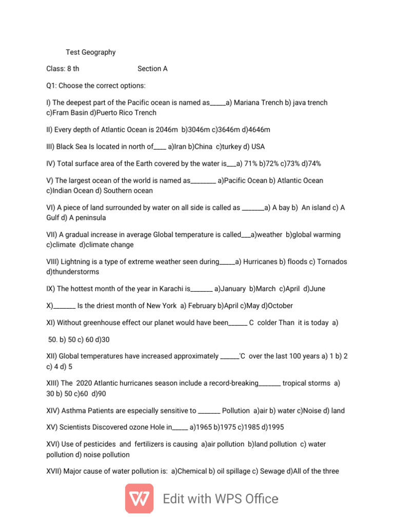 V) The largest ocean of the world is named as________ a)Pacific Ocean b) Atlantic Ocean
