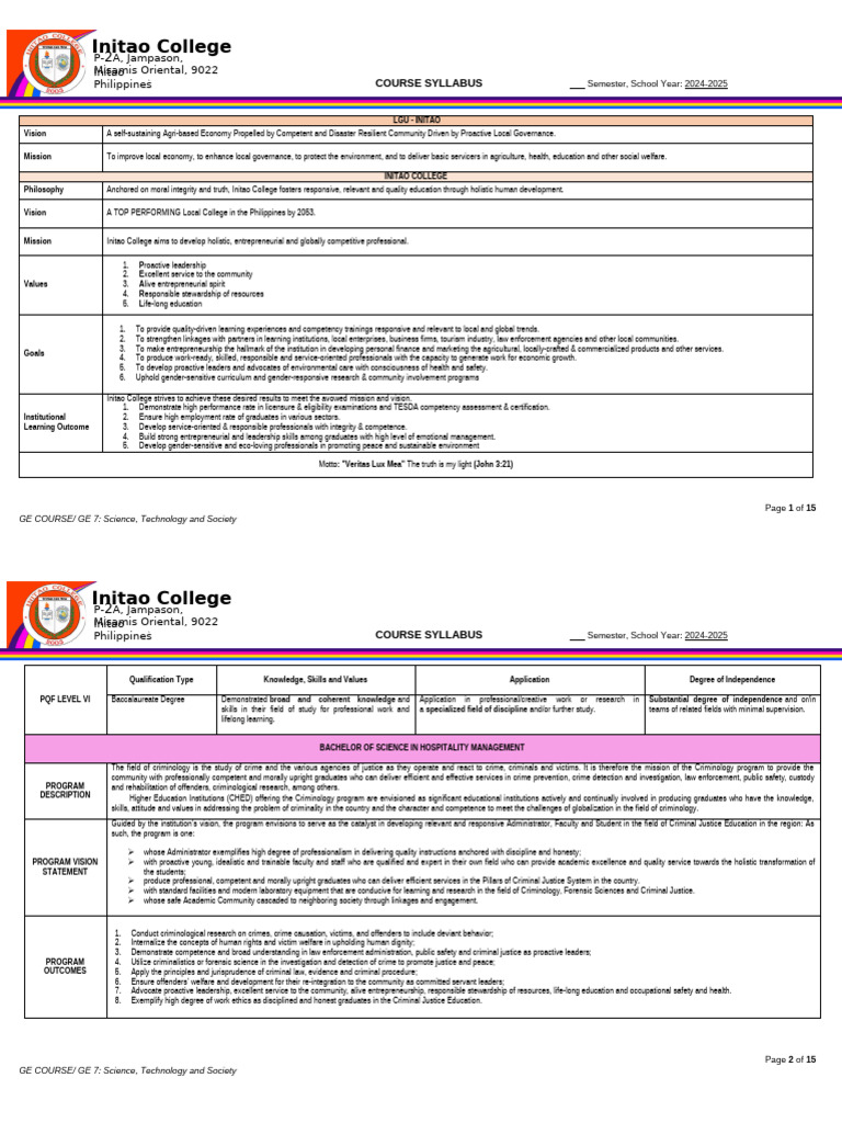 Course Code GE 7 Course Title SCIENCE, TECHNOLOGY AND SOCIETY Credit Units Three (3) Prerequisite None