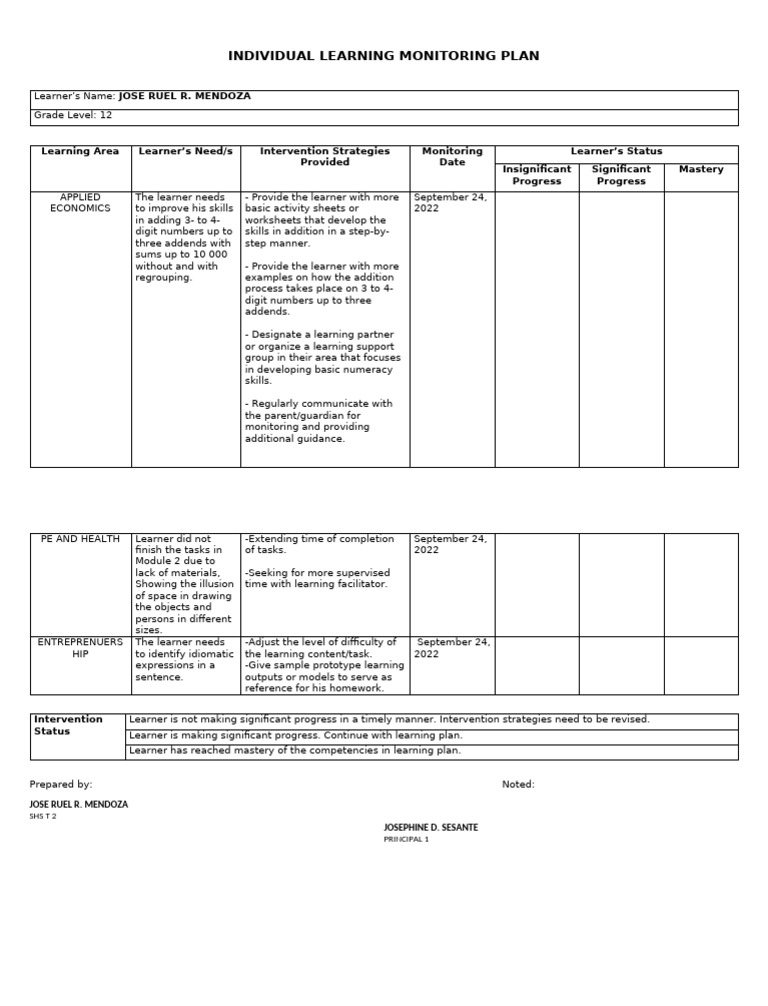 INDIVIDUAL LEARNING MONITORING PLAN