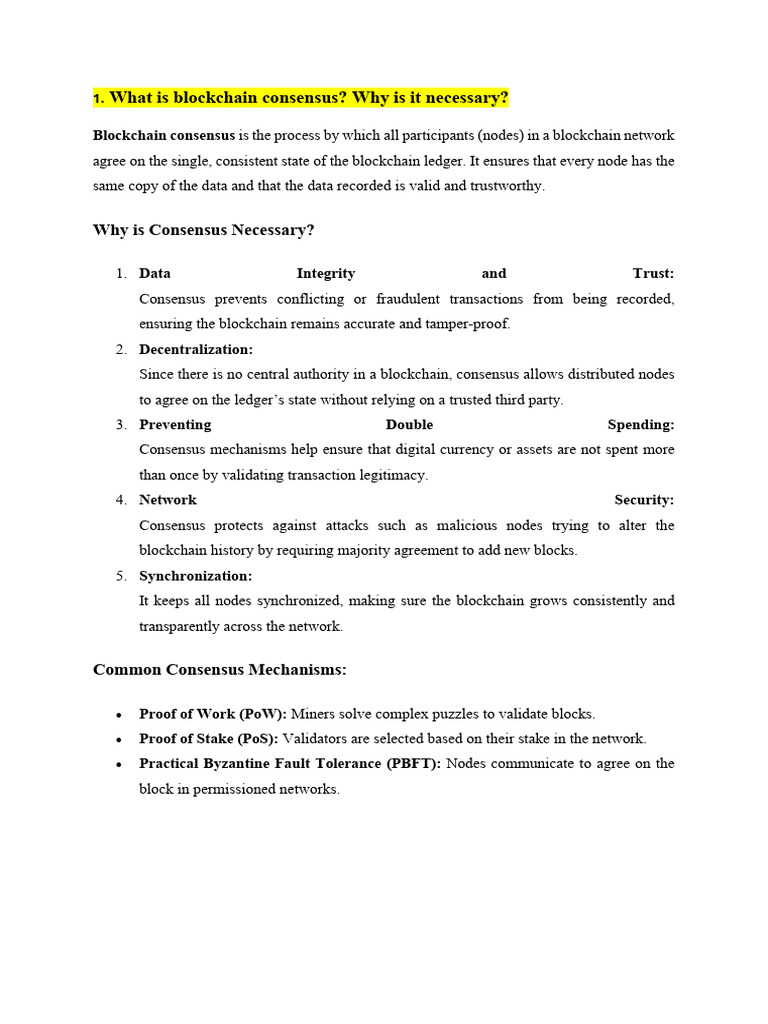1. What is blockchain consensus? Why is it necessary?