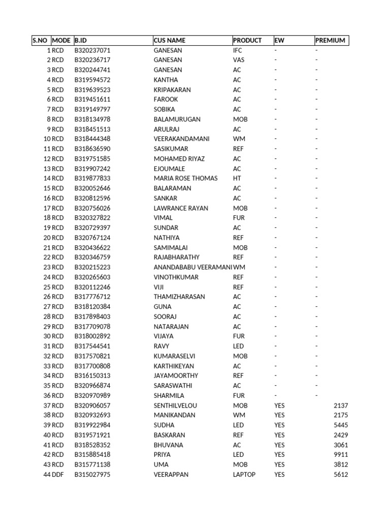 ID CUS NAME PRODUCT EW PREMIUM