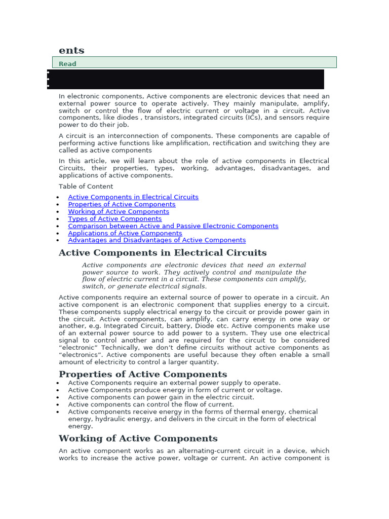 Active components are electronic devices that need an external