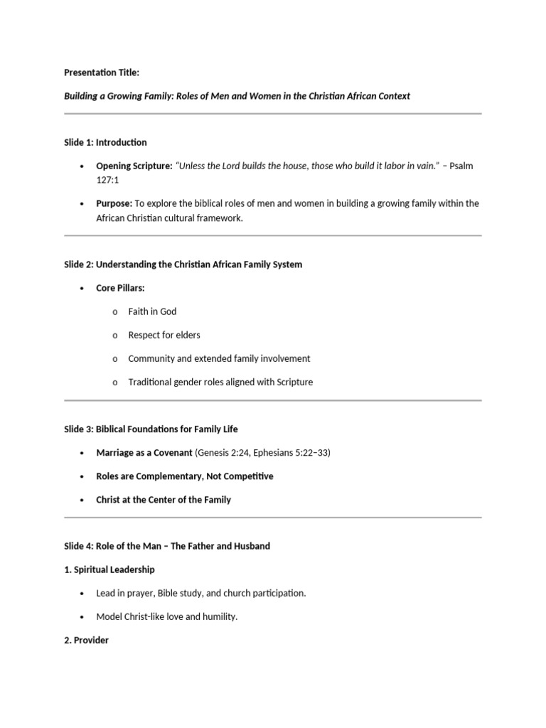 Building a Growing Family: Roles of Men and Women in the Christian African Context