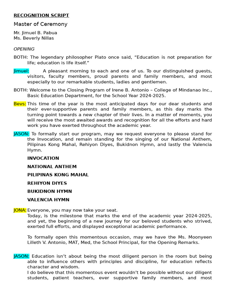 BOTH: Welcome to the Closing Program of Irene B. Antonio – College of Mindanao Inc.,
