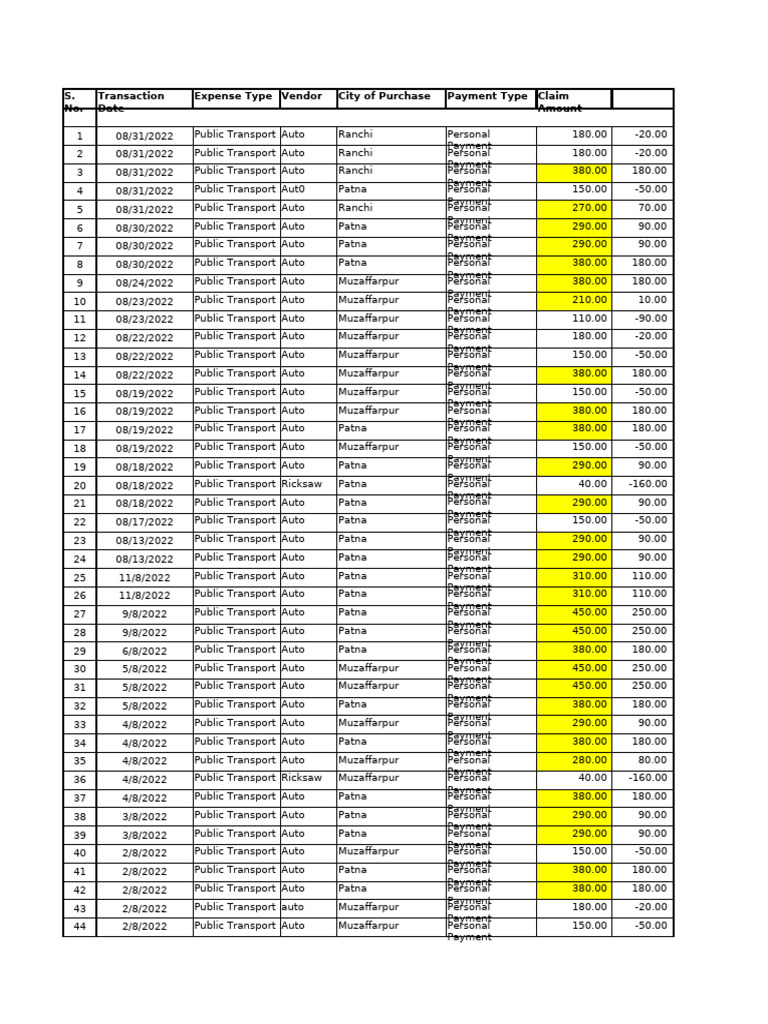 1 08/31/2022 Public Transport Auto Ranchi Personal 180.00 -20.00