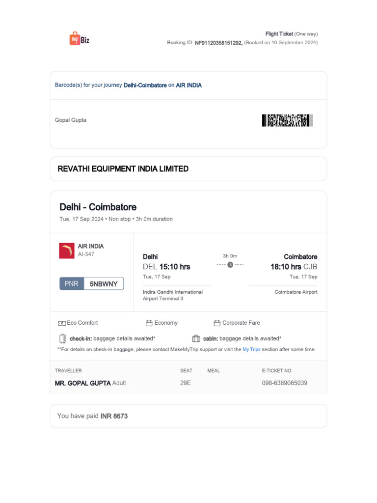 Barcode(s) for your journey Delhi-Coimbatore on AIR INDIA