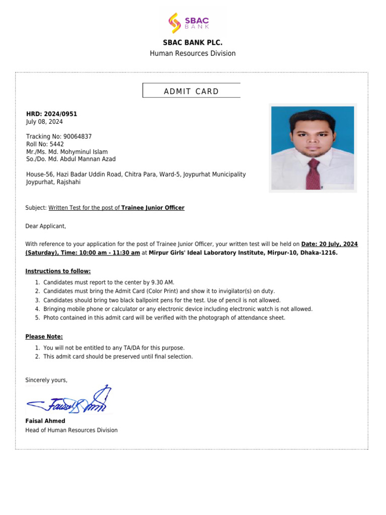5. Photo contained in this admit card will be verified with the photograph of attendance sheet.