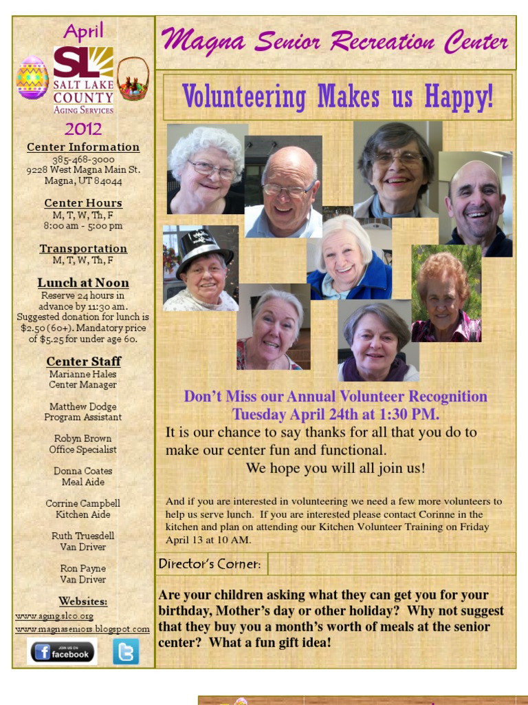 6 Easter Party (All Day) Billiards 9:00 Mexican Dominos 9:00 BAKE SALE 9:30 NEW Art Class 10:00 Haircuts 10:30 Easter Egg Hunt w/Magna Rec Kids 11:00 Kara Lyn Roundy 12:45 Bingo 1:30 Paramedics - BP 2:00 Family History Index 13 9:00 Mexican Dominos 9:30 NEW Art Class 10:00 Haircuts 10:00 Kitchen Volunteer Training 10:30 Walking Group 10:30 Blood Sugar test 12:45 Bingo 1:30 Paramedics - BP 2:00 Family History Index