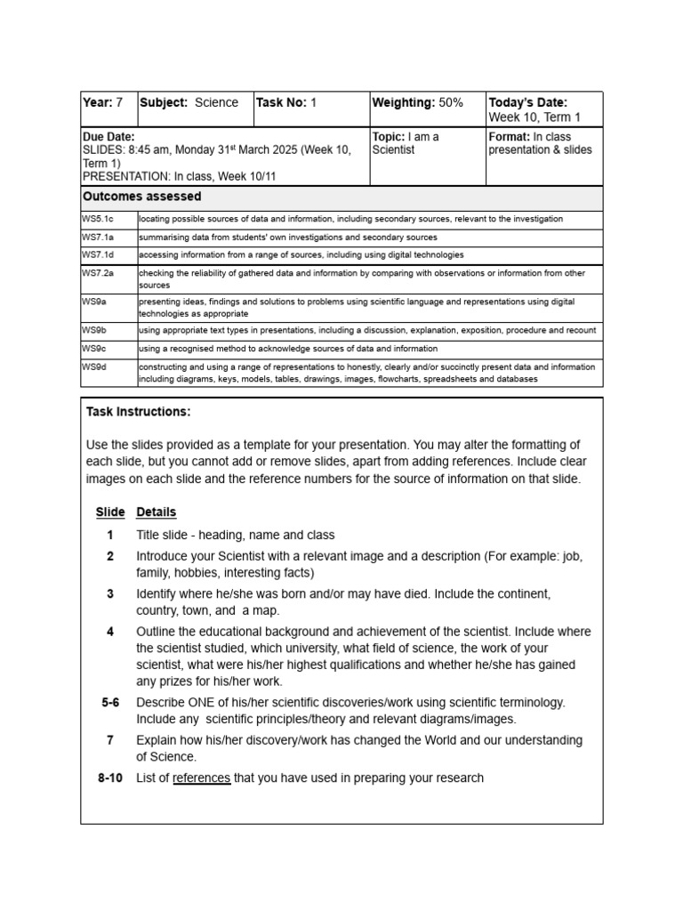 Year: 7 Subject: Science Task No: 1 Weighting: 50% Today’s Date: