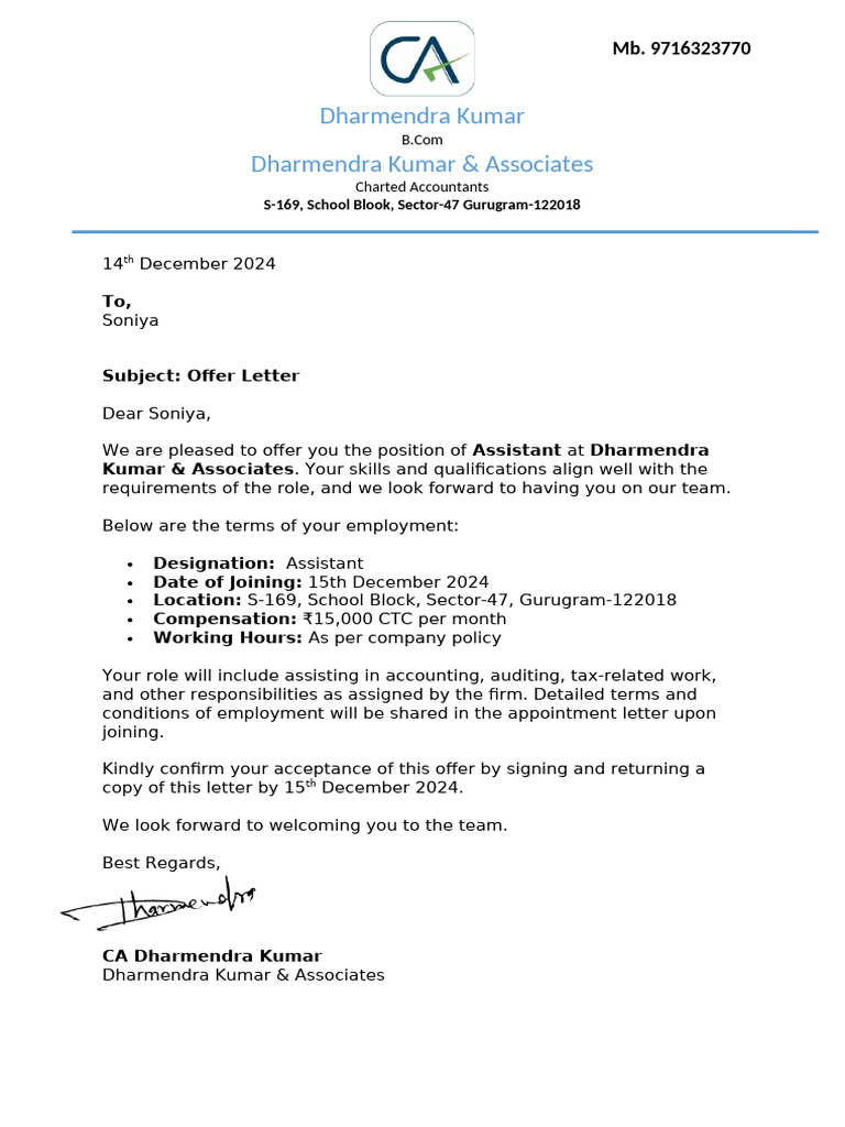 We are pleased to offer you the position of Assistant at Dharmendra