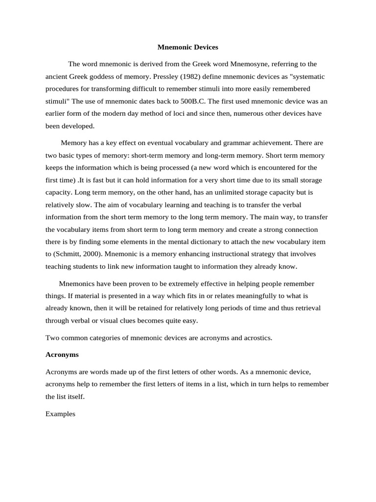 ancient Greek goddess of memory. Pressley (1982) define mnemonic devices as "systematic