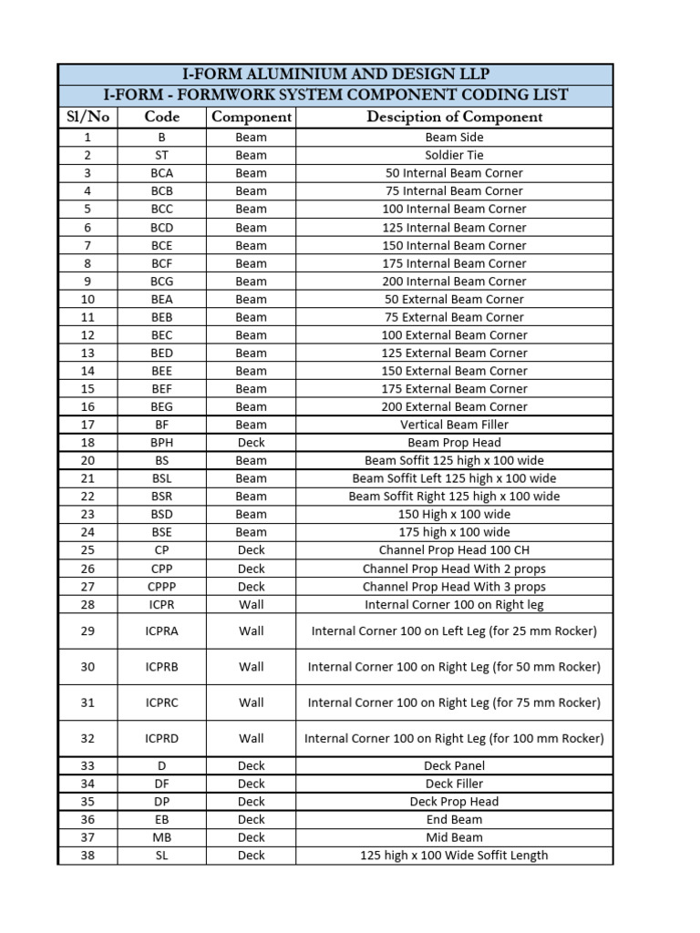 I-FORM - FORMWORK SYSTEM COMPONENT CODING LIST