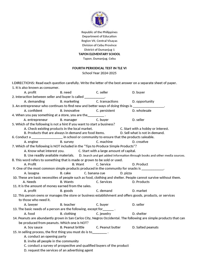 I.DIRECTIONS: Read each question carefully. Write the letter of the best answer on a separate sheet of paper.