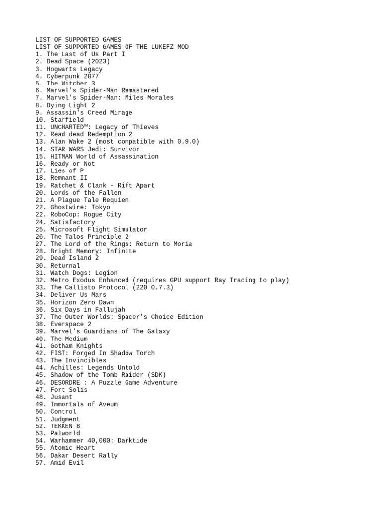 LIST OF SUPPORTED GAMES OF THE LUKEFZ MOD