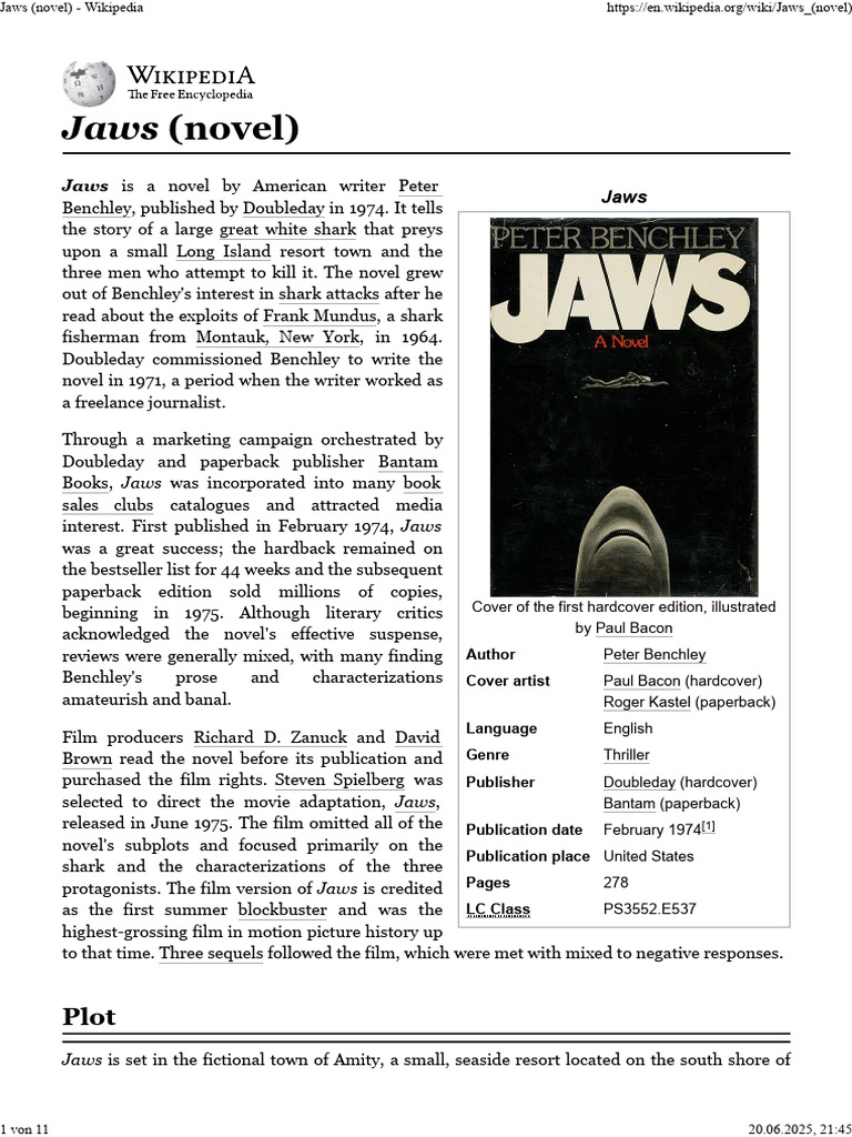 Raftery, Brian (July 12, 2024). "50 Years Ago, 'Jaws' Hit Bookstores, Capturing the Angst of