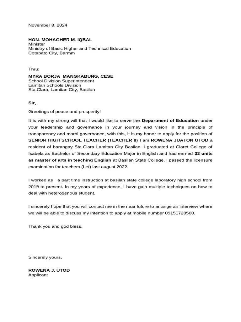 SENIOR HIGH SCHOOL TEACHER (TEACHER ll) I am ROWENA JUATON UTOD a