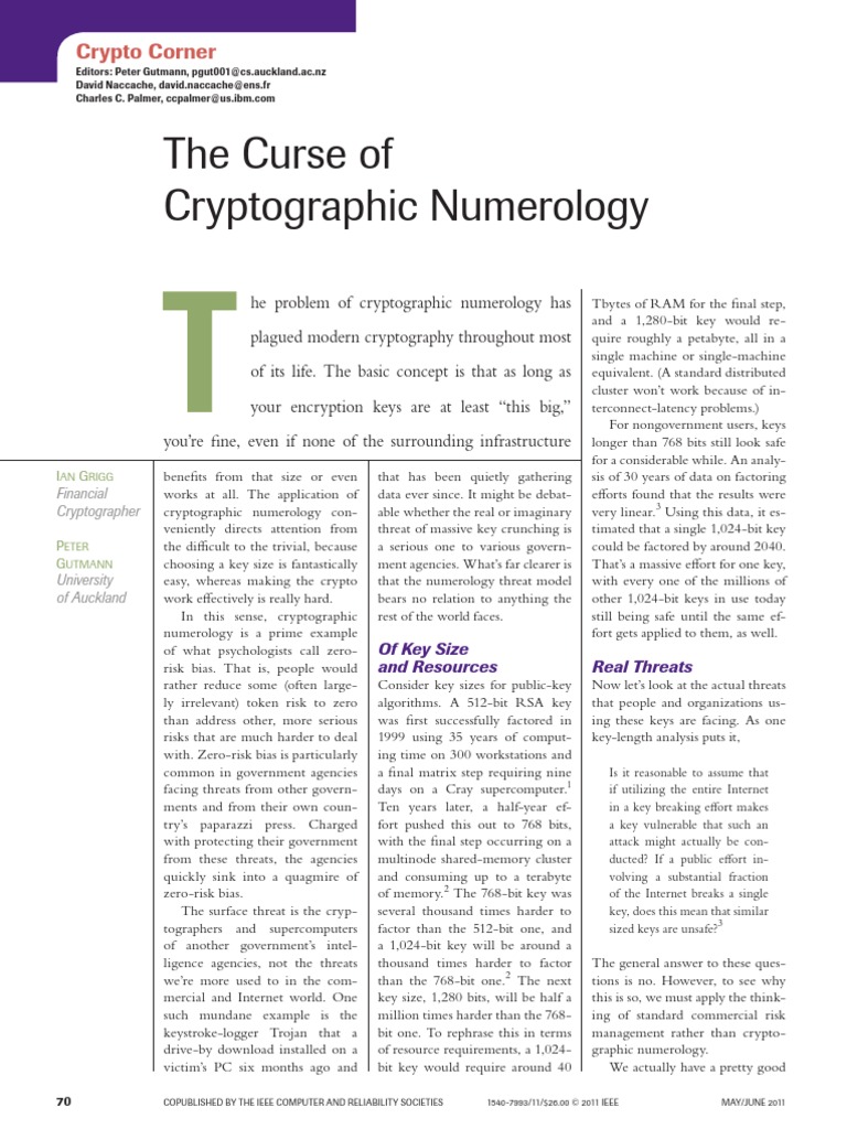 he problem of cryptographic numerology has plagued modern cryptography throughout most of its life. The basic concept is that as long as your encryption keys are at least this big,