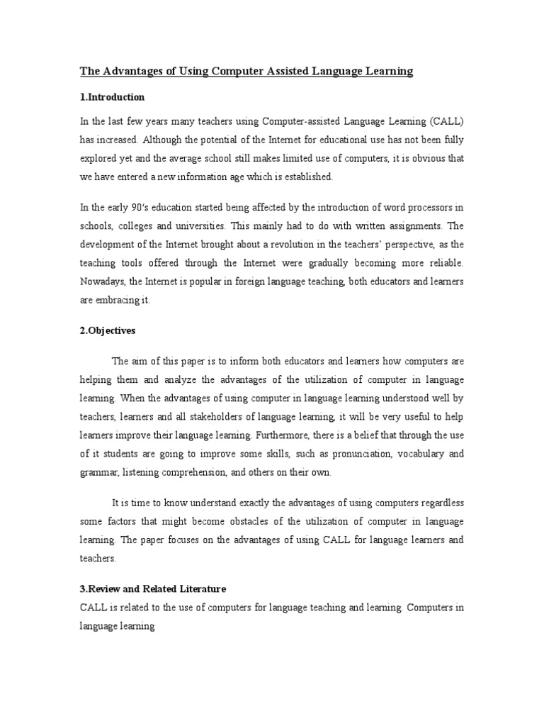 [Link] In the last few years many teachers using Computer-assisted Language Learning (CALL) has increased. Although the potential of the Internet for educational use has not been fully explored yet and the average school still makes limited use of computers, it is obvious that we have entered a new information age which is established. In the early 90s education started being affected by the introduction of word processors in schools, colleges and universities. This mainly had to do with written assignments. The development of the Internet brought about a revolution in the teachers perspective, as the teaching tools offered through the Internet were gradually becoming more reliable. Nowadays, the Internet is popular in foreign language teaching, both educators and learners are embracing it. [Link] The aim of this paper is to inform both educators and learners how computers are helping them and analyze the advantages of the utilization of computer in language learning. When the advantages of using computer in language learning understood well by teachers, learners and all stakeholders of language learning, it will be very useful to help learners improve their language learning. Furthermore, there is a belief that through the use of it students are going to improve some skills, such as pronunciation, vocabulary and grammar, listening comprehension, and others on their own. It is time to know understand exactly the advantages of using computers regardless some factors that might become obstacles of the utilization of computer in language learning. The paper focuses on the advantages of using CALL for language learners and teachers. [Link] and Related Literature CALL is related to the use of computers for language teaching and learning. Computers in language learning