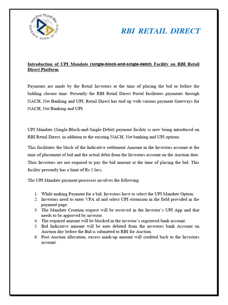 RBI Retail Direct, in addition to the existing NACH, Net banking and UPI options.