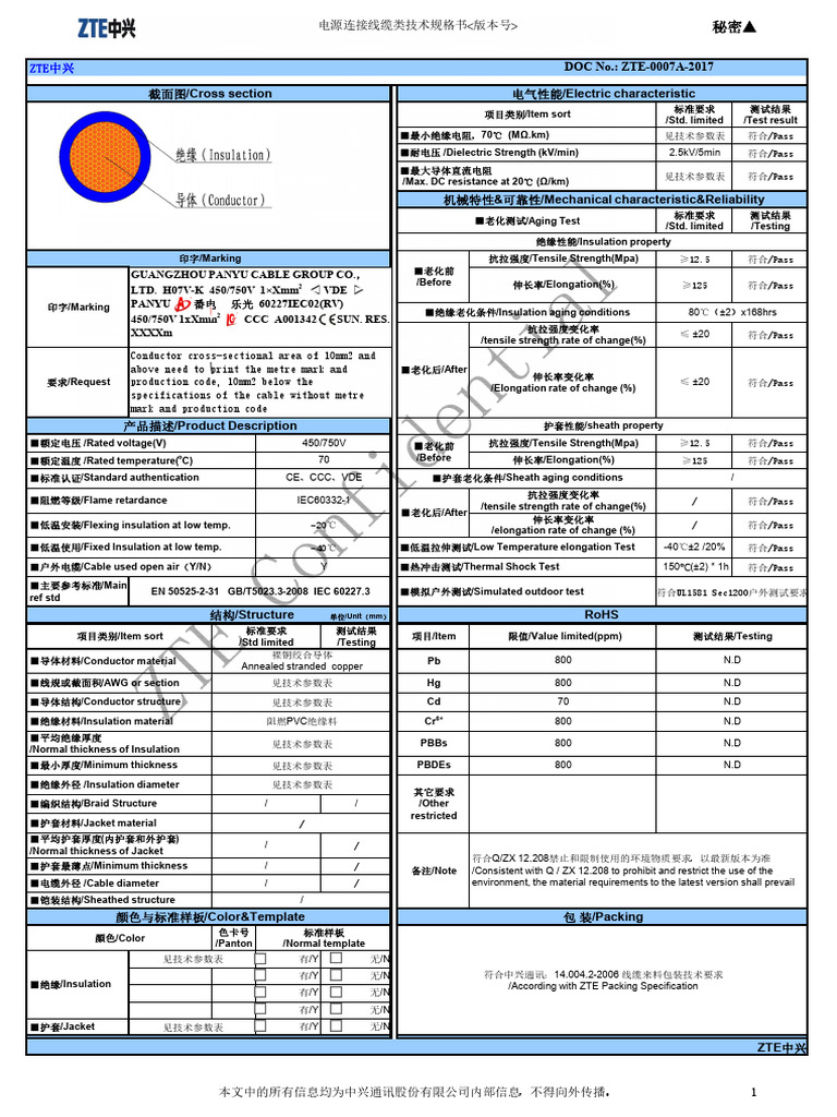 ■额定电压 /Rated voltage(V) 450/750V ■老化前 抗拉强度/Tensile Strength(Mpa) ≥12.5 符合/Pass