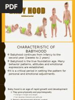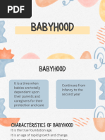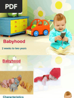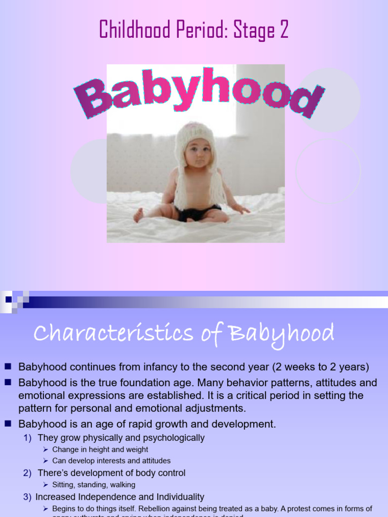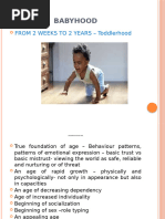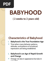 n Babyhood continues from infancy to the second year (2 weeks to 2 years)