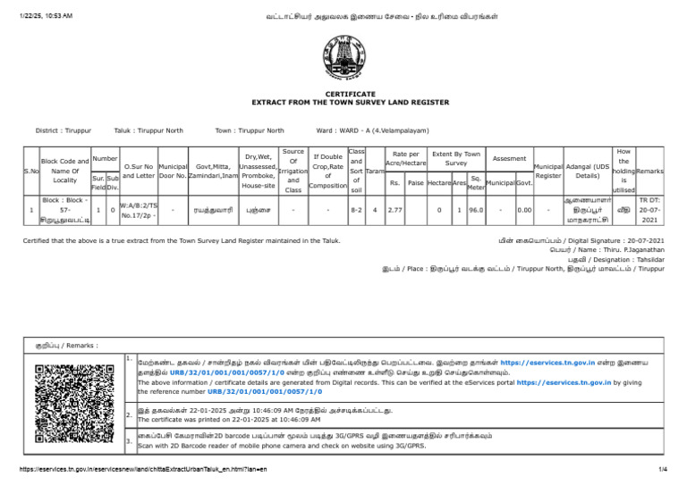 Certified that the above is a true extract from the Town Survey Land Register maintained in the Taluk. மின் கையொப்பம் / Digital Signature : 20-07-2021