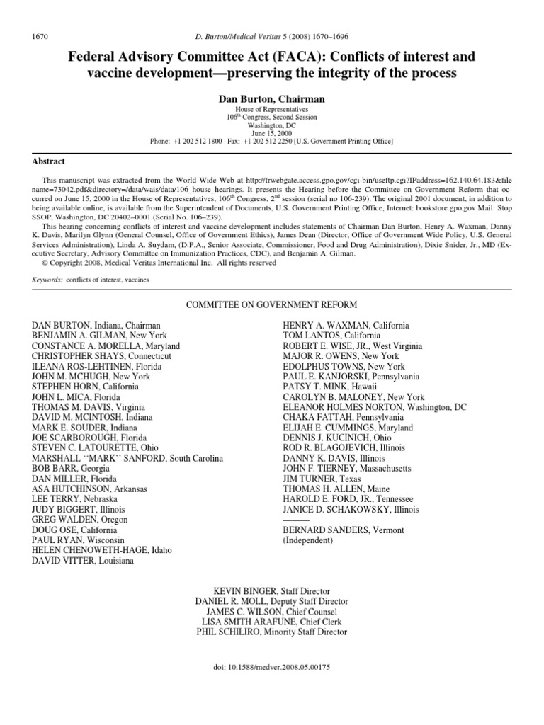 session (serial no 106-239). The original 2001 document, in addition tobeing available online, is available from the Superintendent of Documents, U.S. Government Printing Office, Internet: bookstore.gpo.gov Mail: StopSSOP, Washington, DC 20402–0001 (Serial No. 106–239).This hearing concerning conflicts of interest and vaccine development includes statements of Chairman Dan Burton, Henry A. Waxman, DannyK. Davis, Marilyn Glynn (General Counsel, Office of Government Ethics), James Dean (Director, Office of Government Wide Policy, U.S. GeneralServices Administration), Linda A. Suydam, (D.P.A., Senior Associate, Commissioner, Food and Drug Administration), Dixie Snider, Jr., MD (Ex-ecutive Secretary, Advisory Committee on Immunization Practices, CDC), and Benjamin A. Gilman.© Copyright 2008, Medical Veritas International Inc. All rights reserved