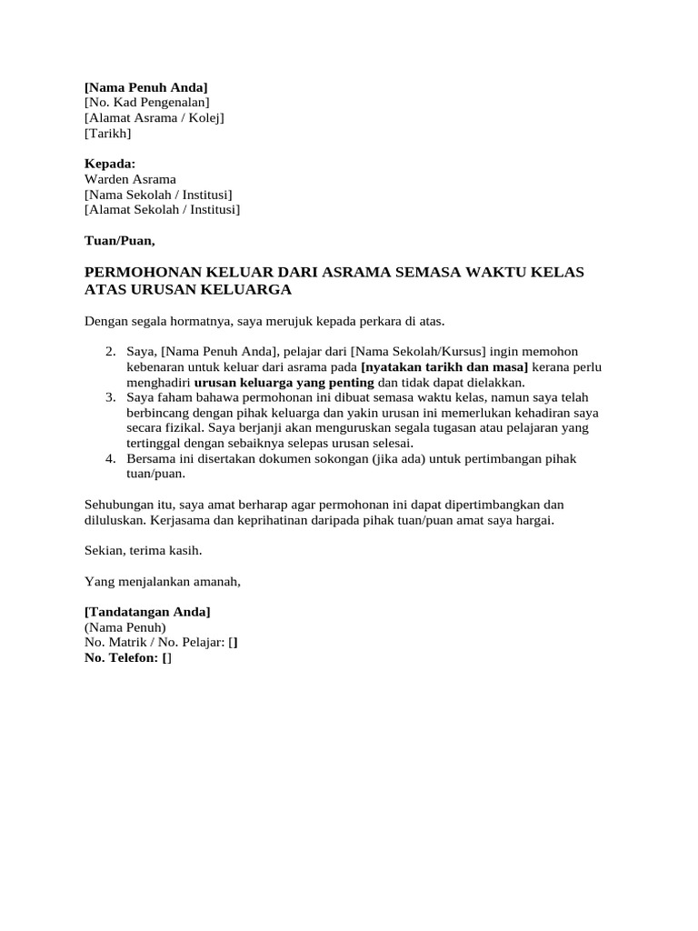 kebenaran untuk keluar dari asrama pada [nyatakan tarikh dan masa] kerana perlu