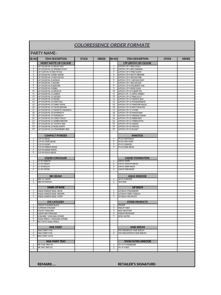 SR NO ITEM DESCRIPTION STOCK ORDER SR NO ITEM DESCRIPTION STOCK ORDER