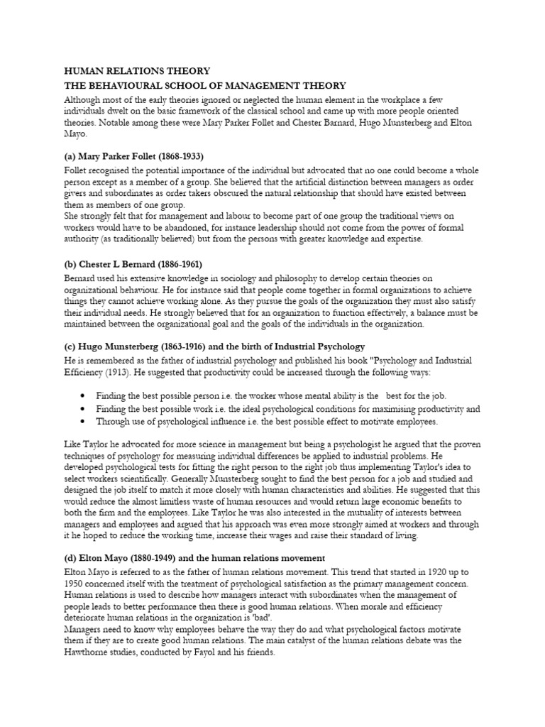 theories. Notable among these were Mary Parker Follet and Chester Barnard, Hugo Munsterberg and Elton
