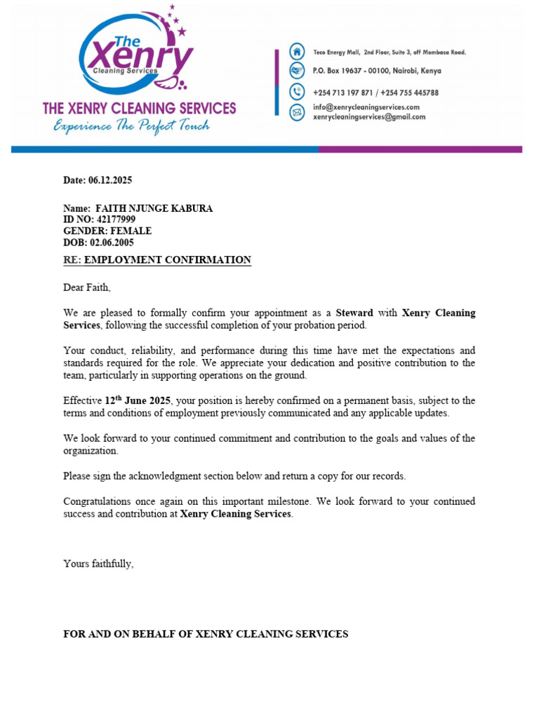 We are pleased to formally confirm your appointment as a Steward with Xenry Cleaning