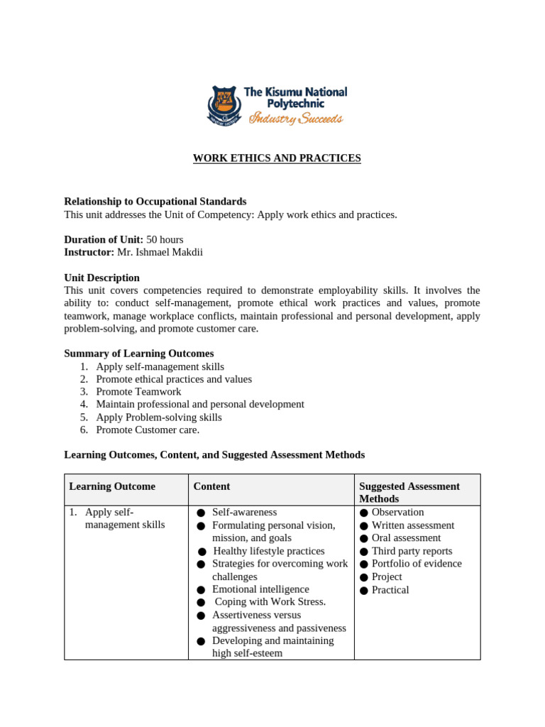 This unit addresses the Unit of Competency: Apply work ethics and practices.