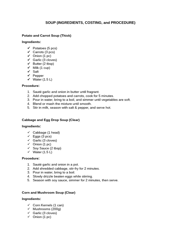 SOUP (INGREDIENTS, COSTING, and PROCEDURE)