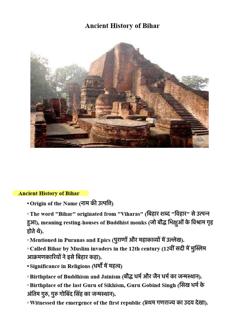 ◦ Important sites: Nalanda, Saran, Munger, Patna, Vaishali (महत्वपूणर् स्थल: नालंदा, सारण, मुंगेर,