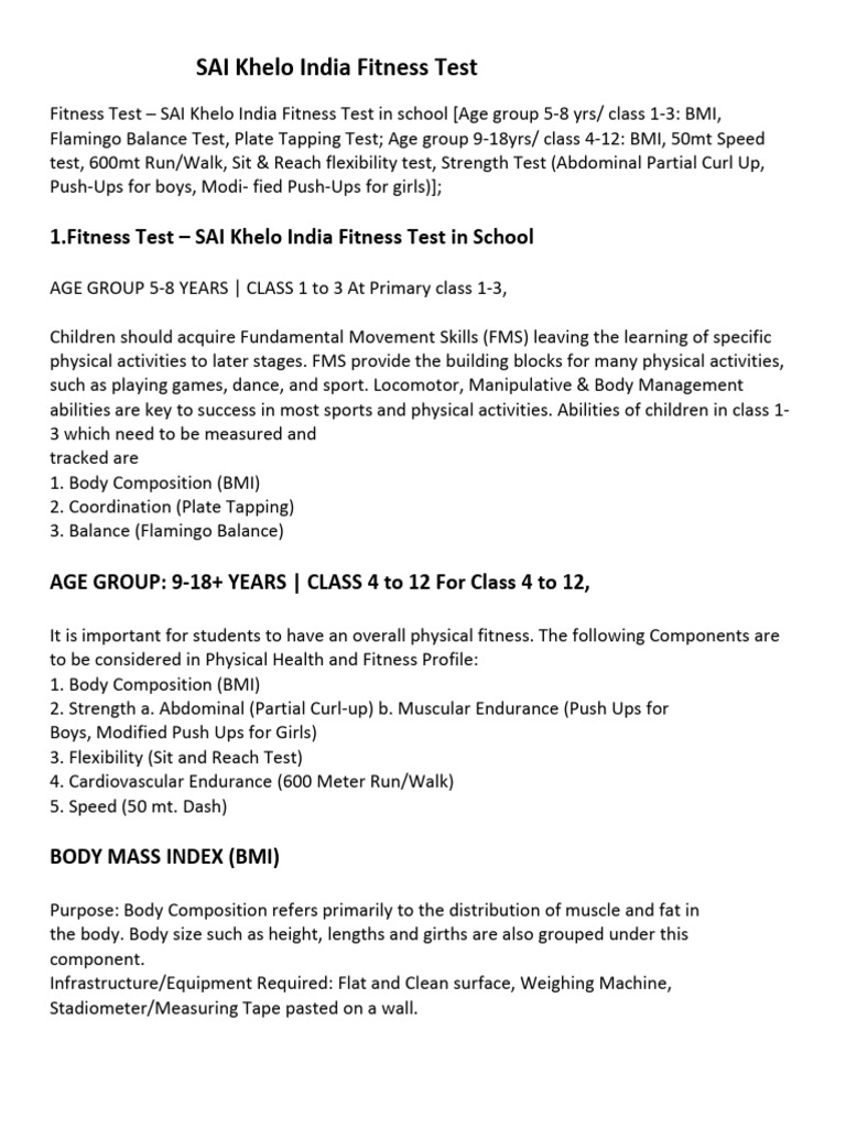 Fitness Test – SAI Khelo India Fitness Test in school [Age group 5-8 yrs/ class 1-3: BMI,