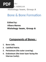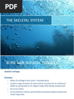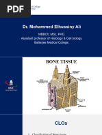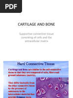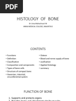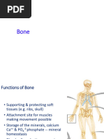 The document discusses the structure and function of bone, detailing its cellular composition, including osteogenic cells, osteoblasts, osteocytes, and osteoclasts, as well as the intercellular matrix. It outlines the functions of bone such as providing support, facilitating movement, and serving as a reservoir for minerals. Additionally, it describes the development of bone through various zones of cartilage and the histological characteristics of compact and cancellous bone.