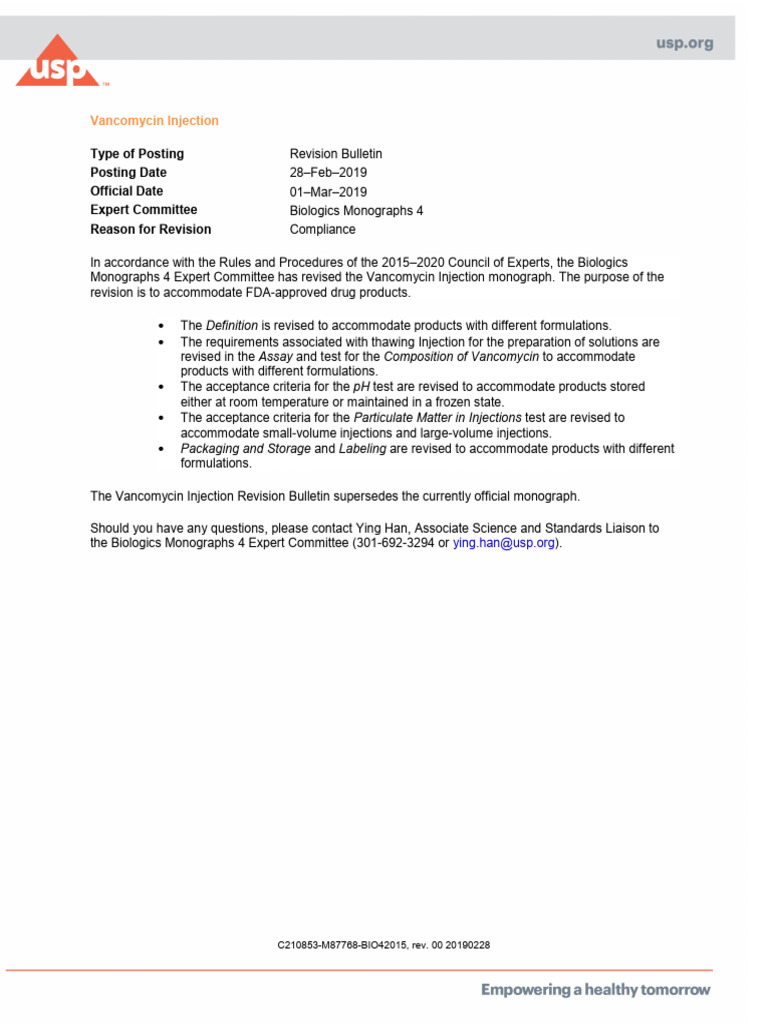 Monographs 4 Expert Committee has revised the Vancomycin Injection monograph. The purpose of the
