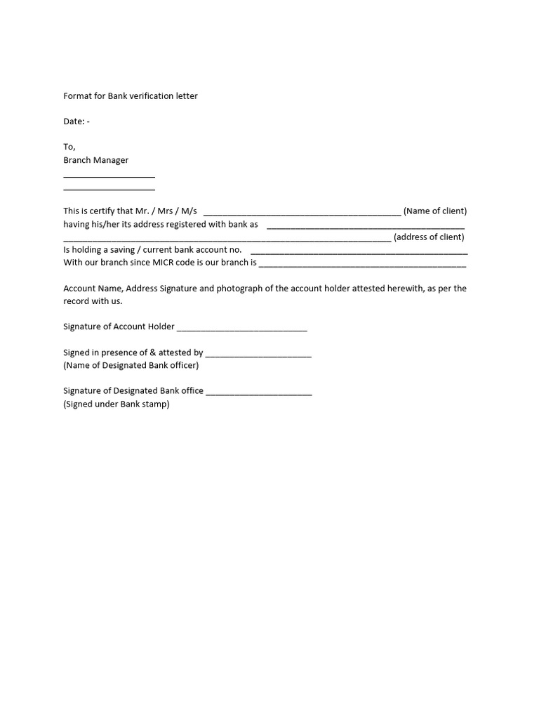 Format for Bank verification letter