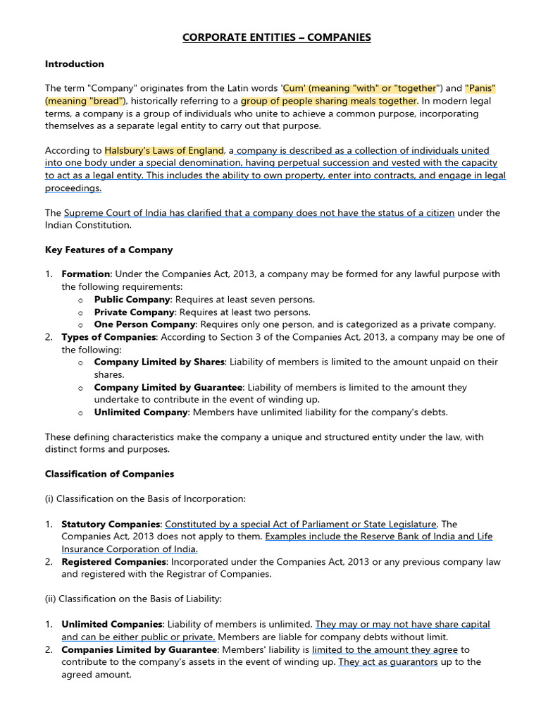 1. Formation: Under the Companies Act, 2013, a company may be formed for any lawful purpose with