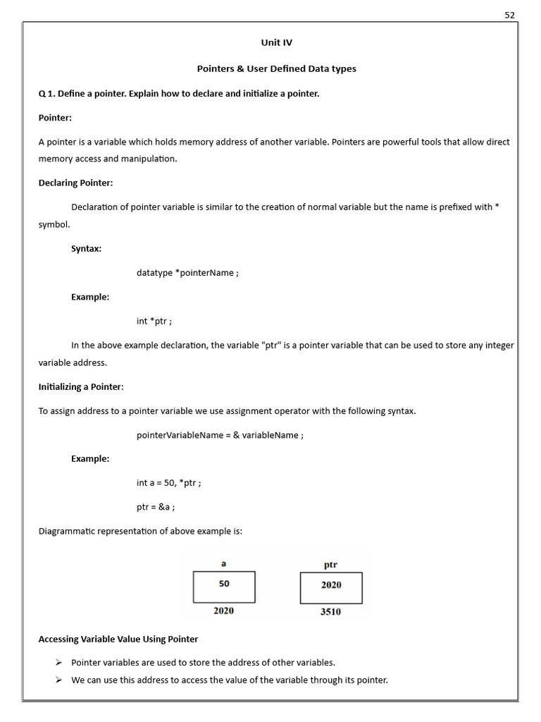 Q 1. Define a pointer. Explain how to declare and ini alize a pointer.
