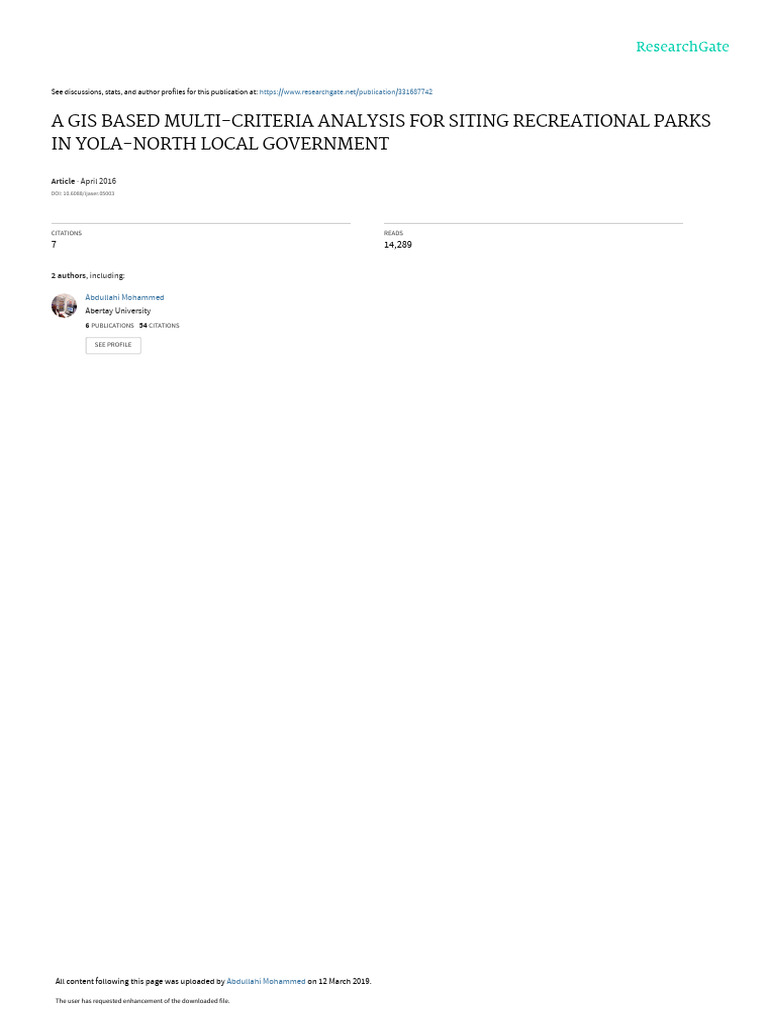 This research was aimed at identifying potential sites for recreational parks in Yola-North local