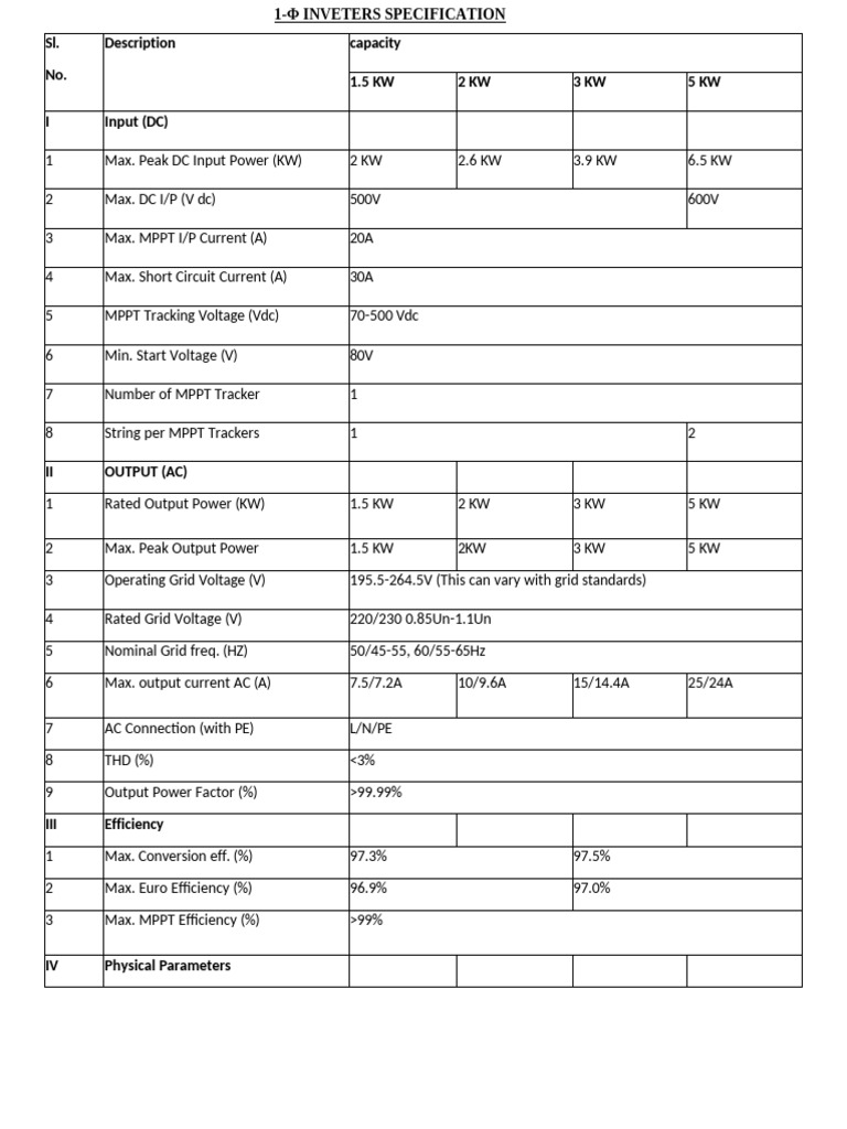 1-Φ INVETERS SPECIFICATION