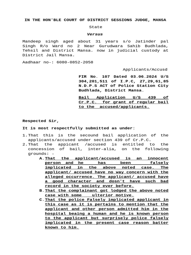 IN THE HON'BLE COURT OF DISTRICT SESSIONS JUDGE, MANSA