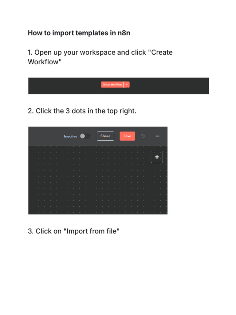 To import templates in n8n, open your workspace and create a workflow. Click the three dots in the top right corner and select 'Import from file'. Finally, import the .JSON file to complete the process.